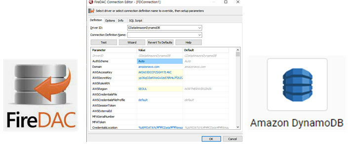 FireDAC는 Data Access Engine으로 Embacdero사의 Delphi 개발 툴에서 기본으로 사용할 수 있다. 그리고 CDATA사의 AWS의 DynamoDB에 쉽게 연결이 가능하도록 한 component를 이용하여 AWS 클라우드의 DB에 접속하여 데이터를 다운로드하거나 조회 할 수 있도록 하였다.