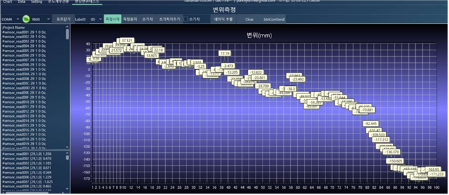 현장변위테스트 : 현장에서 임으로 변위 테스트 할 경우 그래프와 값을 볼 수 있는 화면으로 이동