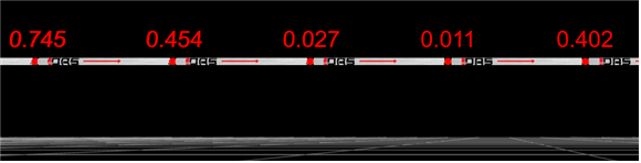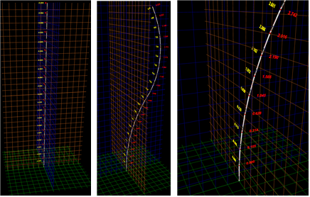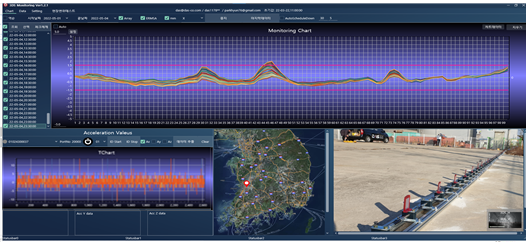 테스트 밴치(김제)의 값을 실제 3D 현상에 적용할 수 있게 되어 있는데 모니터링을 위해 항상 마지막 값을 표현하게 하였다. 아래 이미지에서 보듯이 총 길이 30M에서 수 mm의 변위는 실제 형상에서 유안으로 구분이 안되는 형상 변위이다. 그래서 이를 30배 증폭 시켜서 표현을 할 수 있도록 하였다.
