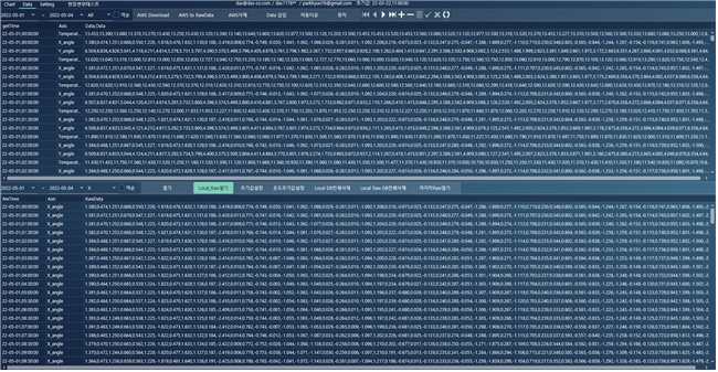 가속도 데이터 차트 : 해당 관절의 가속도 측정 데이터를 차트로 실시간으로 보여줌, 현재 별도의 LTE모뎀을 사용하여 TCP 통신으로 접속 받음. 기본 개념은 유선 시리얼 통신으로 데이터를 획득
