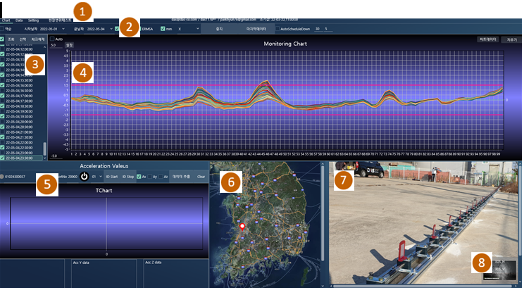 - Chart : 100개 관절에 대한 변위 그래프와 , 가속도 그래프 등을 볼 수 있는 메인 화면으로 이동