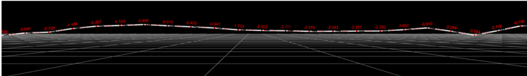 테스트 밴치(김제)의 값을 실제 3D 현상에 적용할 수 있게 되어 있는데 모니터링을 위해 항상 마지막 값을 표현하게 하였다. 아래 이미지에서 보듯이 총 길이 30M에서 수 mm의 변위는 실제 형상에서 유안으로 구분이 안되는 형상 변위이다. 그래서 이를 30배 증폭 시켜서 표현을 할 수 있도록 하였다.