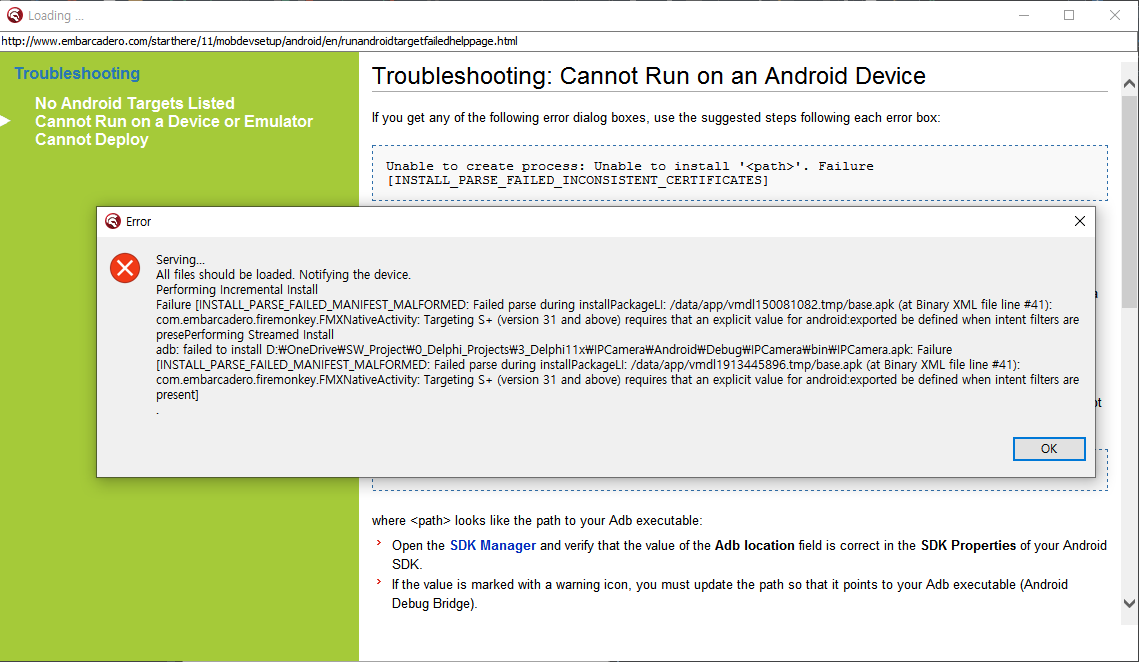 갤럭시 S22 울트라와 연결하여 디버깅하니 에러가 발생했다.